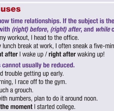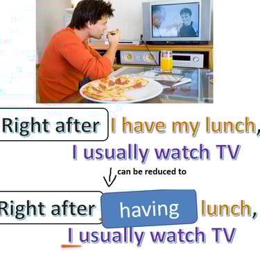 When you have two (or more) actions done by the same person (or animal), the sentence with time expressions (while, when, [right] before, [right] after) can be reduced. The formula is: Eliminate the person doing the action, and the action goes to ING.